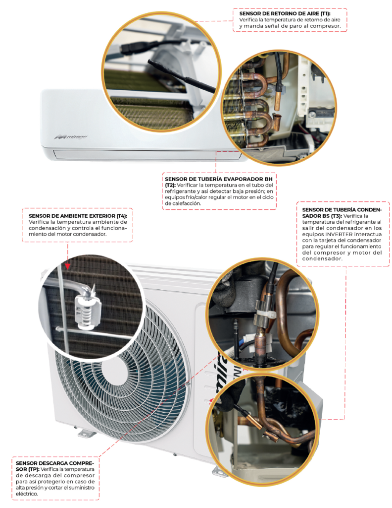 En los sistemas de refrigeración inverter, los sensores trabajan en conjunto con las tarjetas electrónicas (evaporador y condensador), para regular la operación del compresor, motor de turbina y motor del aspa; en los equipos Mirage la tarjeta principal revisa los valores de los sensores cada 20 segundos, para así ajustar el consumo energético de todo el equipo y lograr la máxima eficiencia.