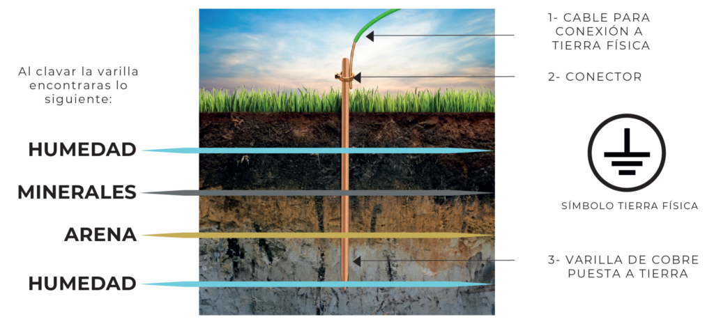 Una conexión a tierra cumple la función de drenar la acumulación de cargas no deseadas. Ésta consiste en una varilla de cobre clavada en el suelo a la que se le conecta un conductor, que forma parte de la instalación eléctrica.